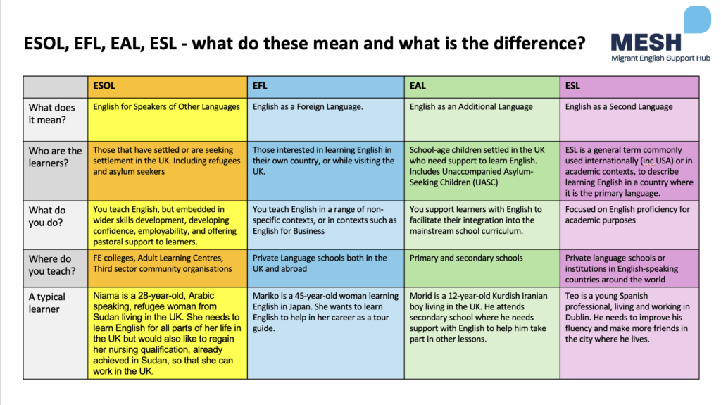 One point that both ESOL managers speak about in the above interviews is the difference between ESOL and other forms of English teaching.  It can be confusing as there are several different types of English learning – ESOL, EFL, EAL and others – delivered in different sectors with different target groups.  The table below provides some guidance on the key differences.